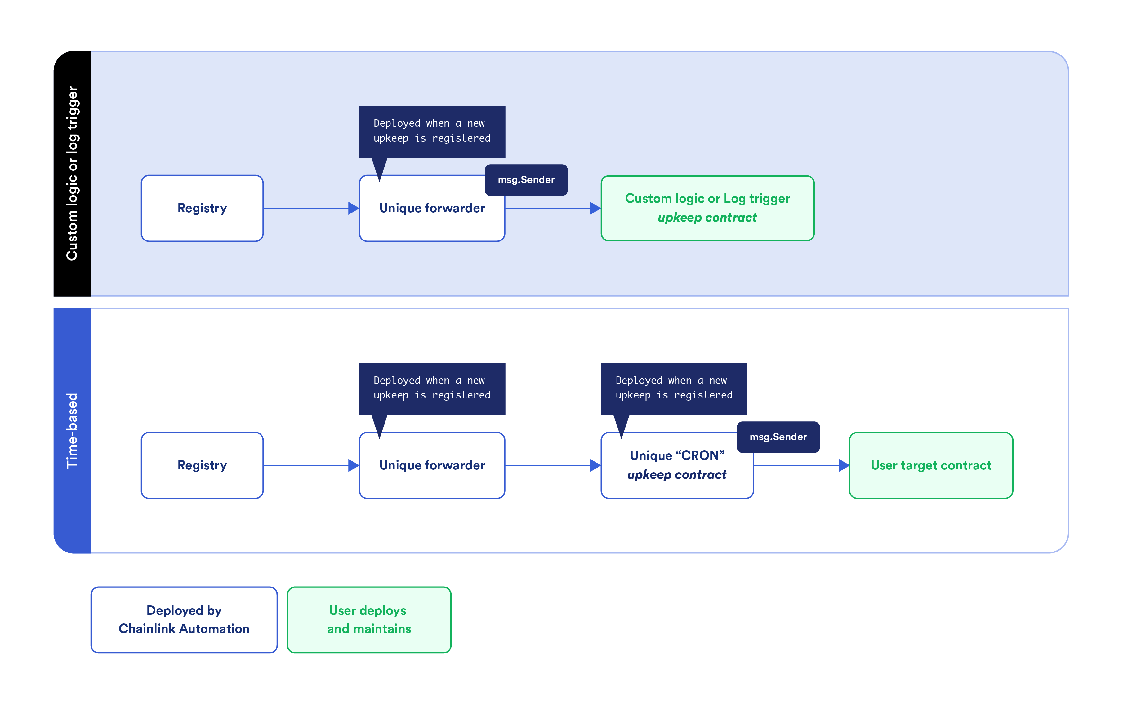 in relation to your contract is the unique forwarder that Automation deploys when you migrate your upkeep. - For time-based upkeeps, Automation deploys a unique forwarder and a unique CRON upkeep contract. In this case, the CRON upkeep contract is the